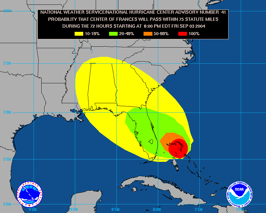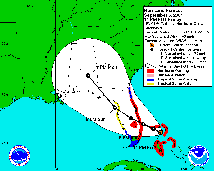 Naputtelen tätä "raporttia" toiselta kämpältä. Frances on melkein pysähtynyt kökkimään Bahaman saarten ylle (liikkui 4 mailia tunnissa viime kuuleman mukaan), ja samalla arvioitu maihiniskeytymisen ajankohta on siirtynyt myöhäisemmäksi.